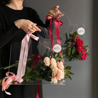 К букету мы можем приложить бесплатную фирменную открытку с нашим логотипом. Для дальнейшей комфортной транспортировки предлагаем Вам добавить к заказу аквапак и нашу фирменную сумку-переноску.